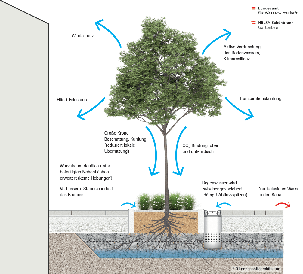 Blau-grüne Elemente wie entsiegelte Flächen, Mulden, versickerungsfähige Beläge, begrünte Dächer oder Bäume spielen dabei eine zentrale Rolle. Diese Infrastruktur sorgt nicht nur für eine verbesserte Wasserspeicherung, sondern kühlt das Stadtklima, verbessert die Grundwasserneubildung und steigert die Lebensqualität und biodiverse Stadtlandschaften.